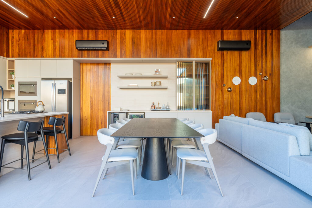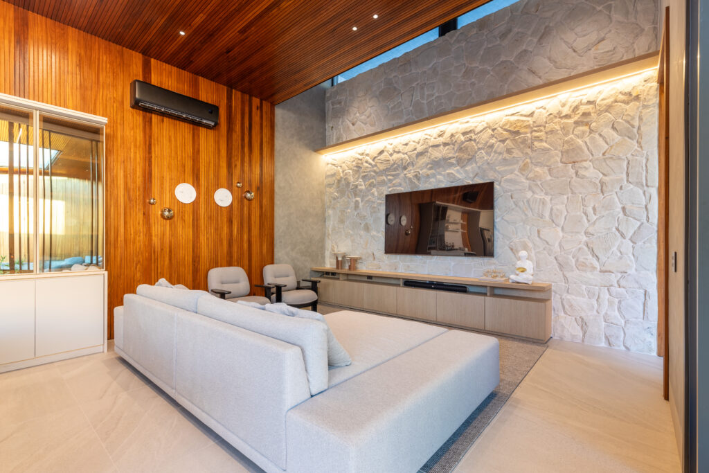 Na Casa Ametista, cada detalhe foi pensado para criar uma atmosfera acolhedora e sofisticada. A madeira natural abraça os espaços com calor e textura, enquanto a luz natural percorre os ambientes, valorizando as linhas puras e o design minimalista.