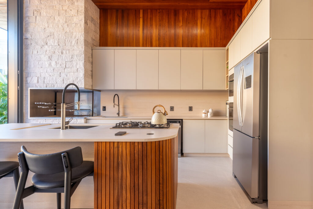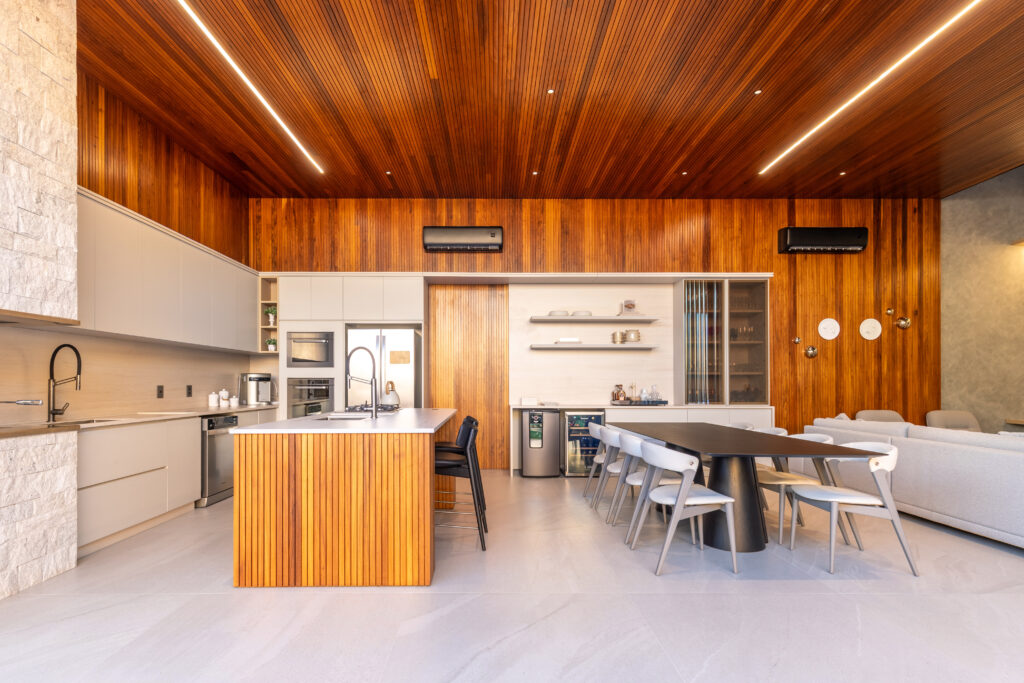 A área externa conecta-se de forma orgânica com os interiores, revelando uma piscina que reflete o céu e traz frescor ao cotidiano. A cozinha gourmet e o living integrados convidam para momentos de convivência, sem abrir mão da sofisticação.