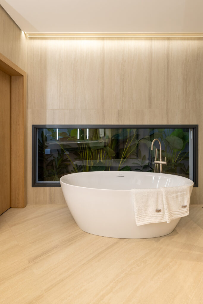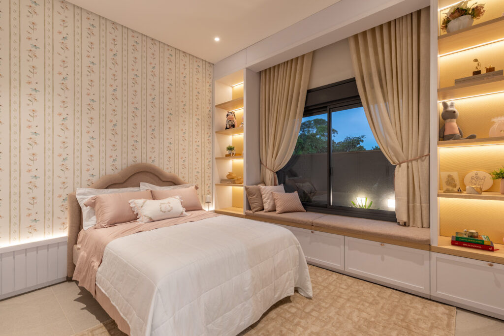 Nos quartos e banheiros, o projeto aposta na suavidade das cores neutras e na delicadeza da iluminação indireta, criando ambientes que inspiram relaxamento e bem-estar.