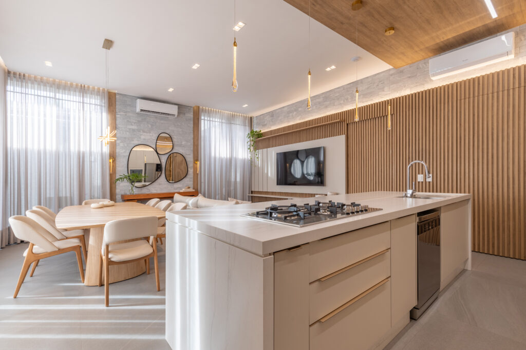 Na área social, a cozinha se abre para a sala e para a área externa, em um gesto de conexão que transforma o receber em experiência. O tom amadeirado aquece o ambiente, enquanto o mobiliário e os acabamentos claros ressaltam a sensação de amplitude e frescor.