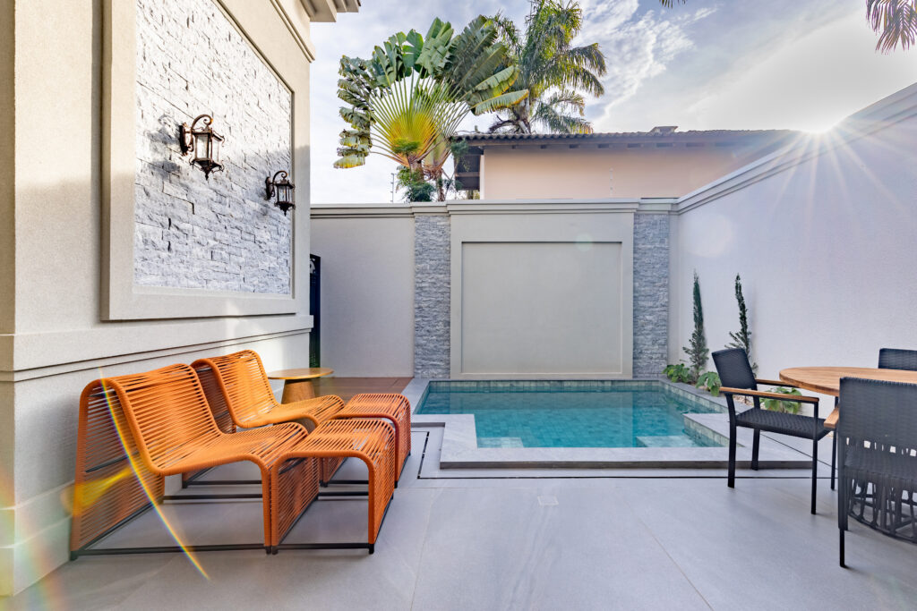 Os detalhes – do espelho orgânico na sala ao revestimento delicado do banheiro – mostram a delicadeza em cada escolha, pensada para unir estética e funcionalidade. A área externa com piscina, cercada por detalhes em pedra e madeira, completa a atmosfera de refúgio urbano: íntima, convidativa e inspiradora.