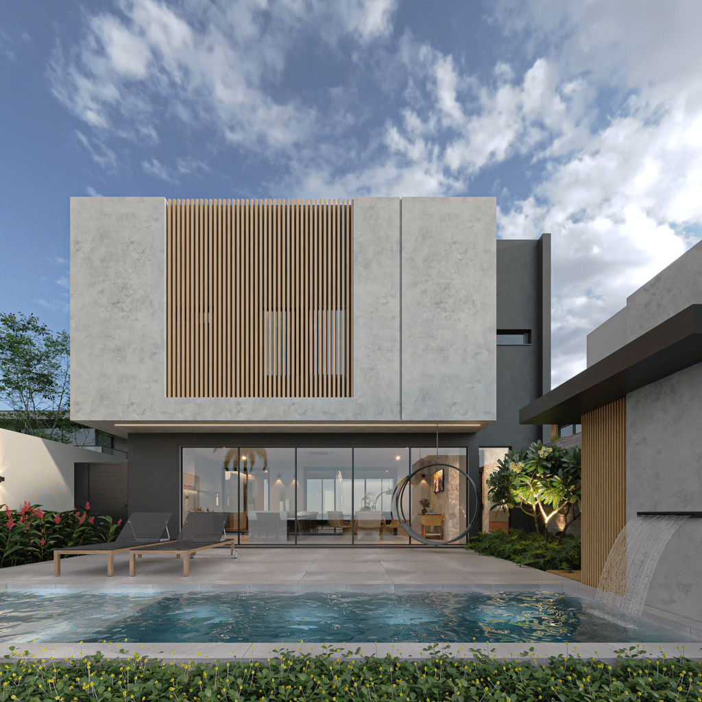 O concreto aparente e o ripado em madeira natural se equilibram entre força e leveza, enquanto o preto dá contorno e profundidade à composição. A fachada se revela com linhas limpas e proporções precisas, valorizadas por uma iluminação cênica que exalta o jogo entre sombra e textura.