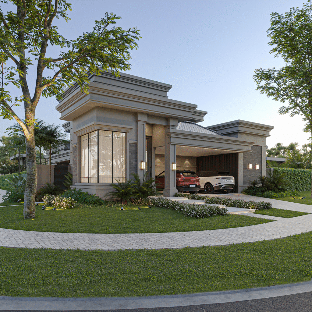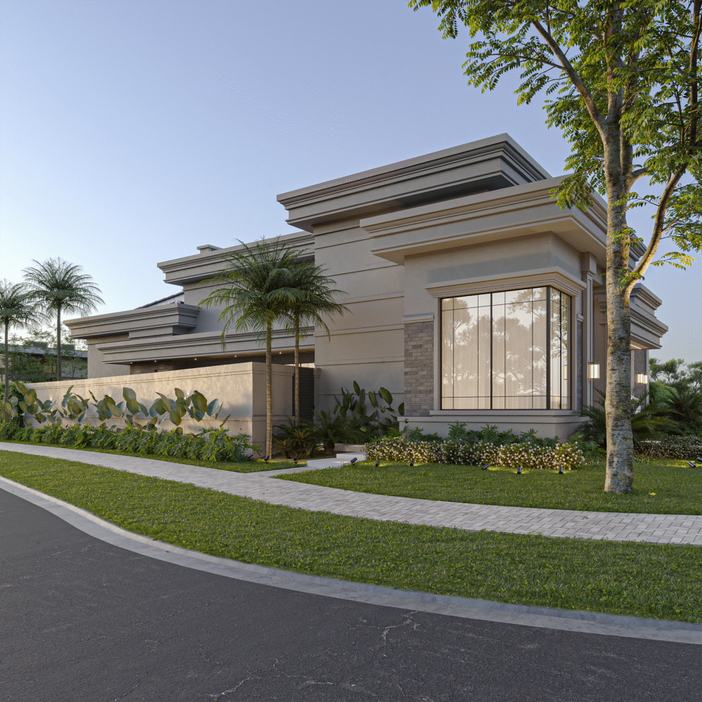 Com volumetria clássica reinterpretada sob uma linguagem contemporânea, o projeto valoriza o contraste entre a sobriedade das formas e a suavidade dos tons. As molduras marcam presença com sutileza, enquanto o paisagismo e a iluminação se encarregam de emoldurar a casa com vida e serenidade.