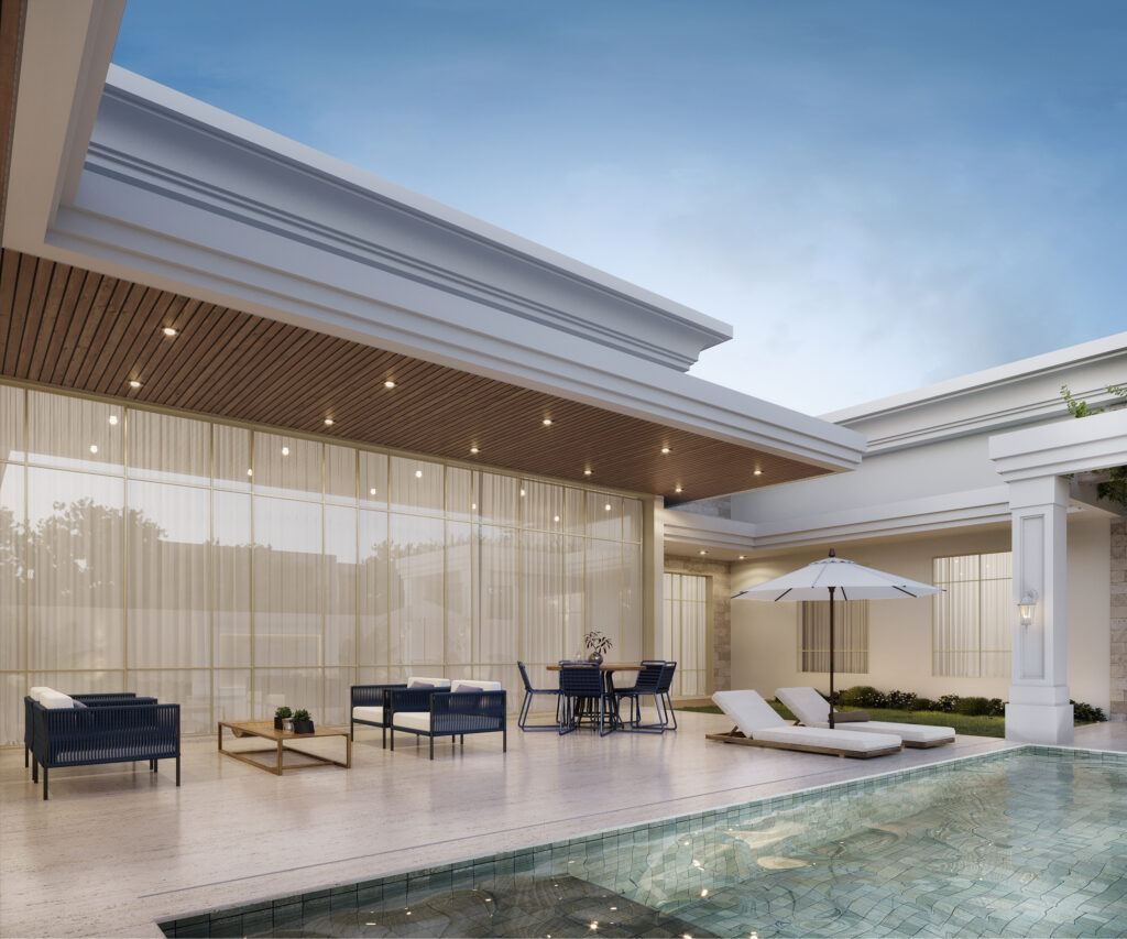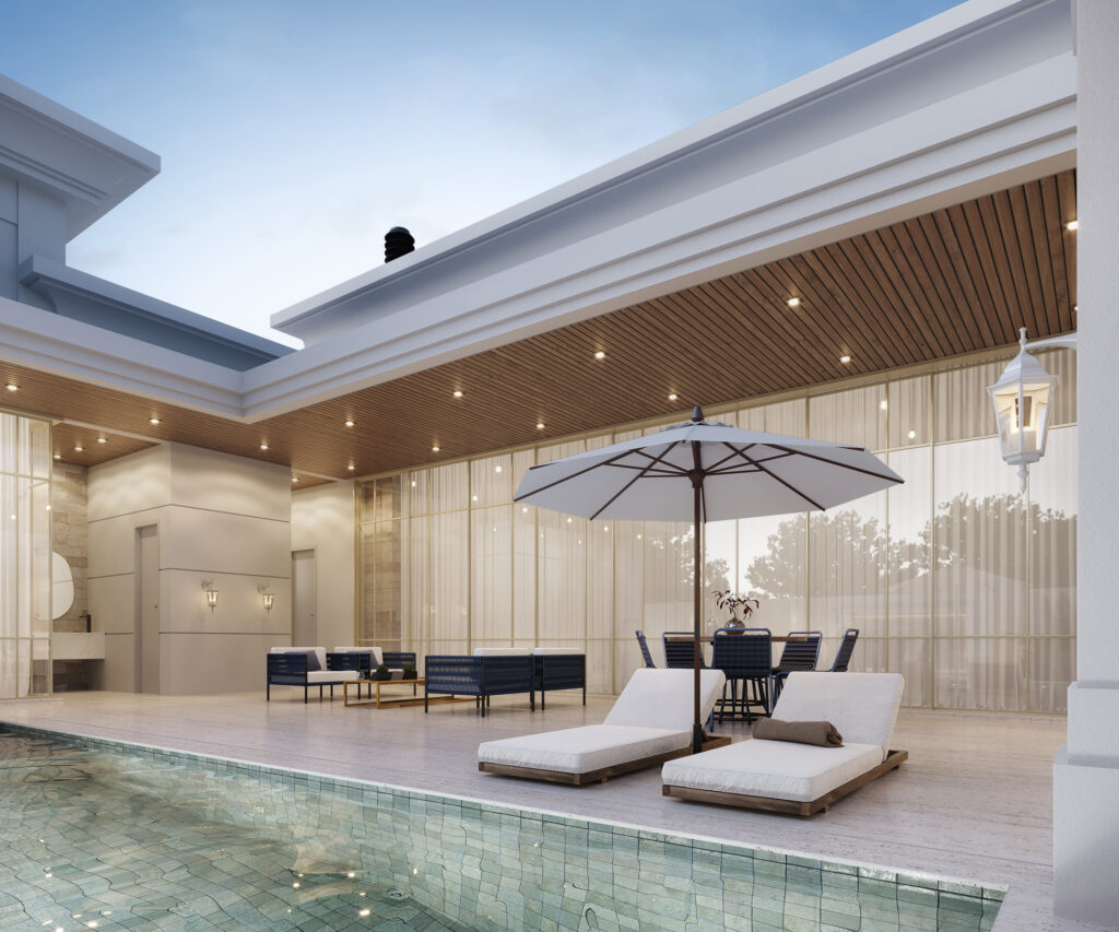 A área de lazer é um respiro de luz e harmonia: piscina, pergolado e mobiliário compõem um cenário que celebra o bem viver.