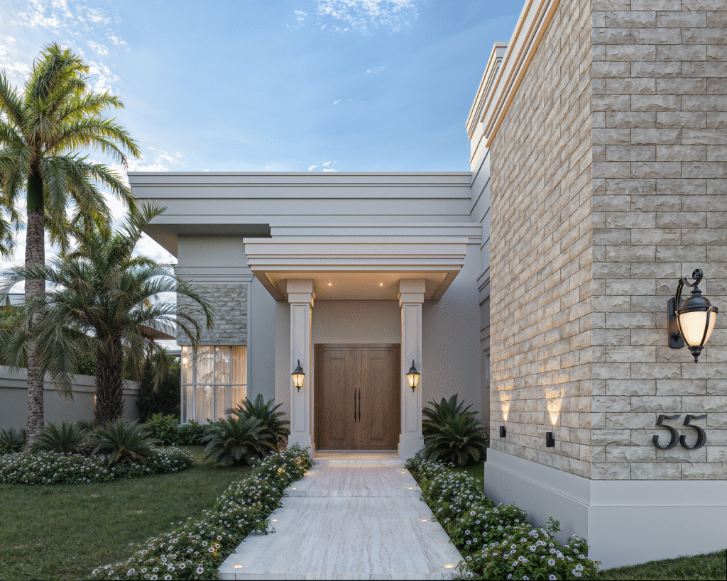 Os tons neutros abraçam a fachada com serenidade, enquanto o contraste entre pedra, madeira e iluminação cria um ritmo visual sofisticado e acolhedor.