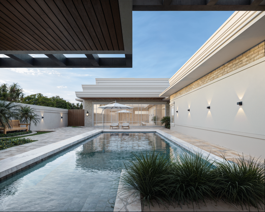 Na área de lazer, o reflexo da piscina traduz o espírito da casa — calma, contemplativa e cheia de vida.