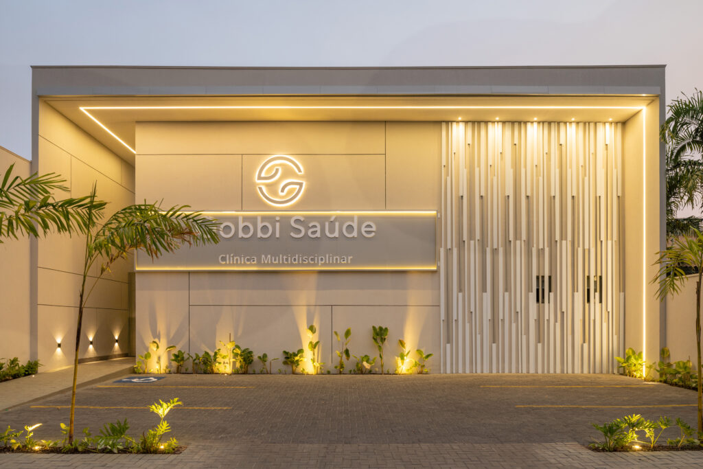 A fachada minimalista e contemporânea anuncia o conceito: saúde com sofisticação e serenidade.