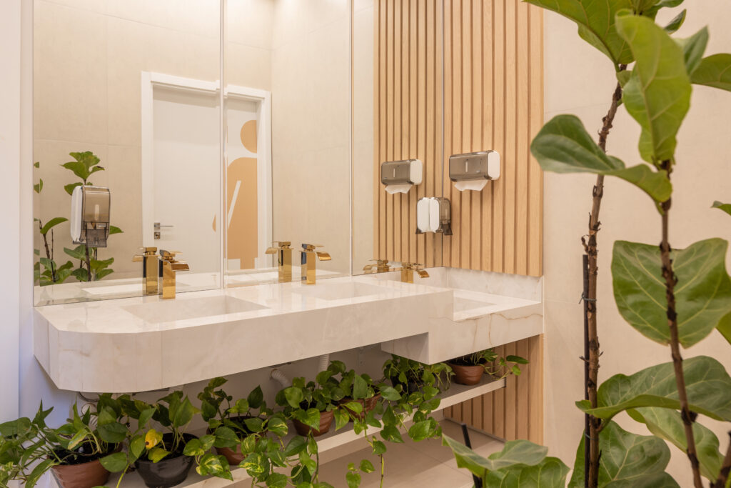 O uso do branco, da madeira e do dourado cria um ambiente sensorial e equilibrado — onde o olhar descansa e o corpo se sente seguro.
