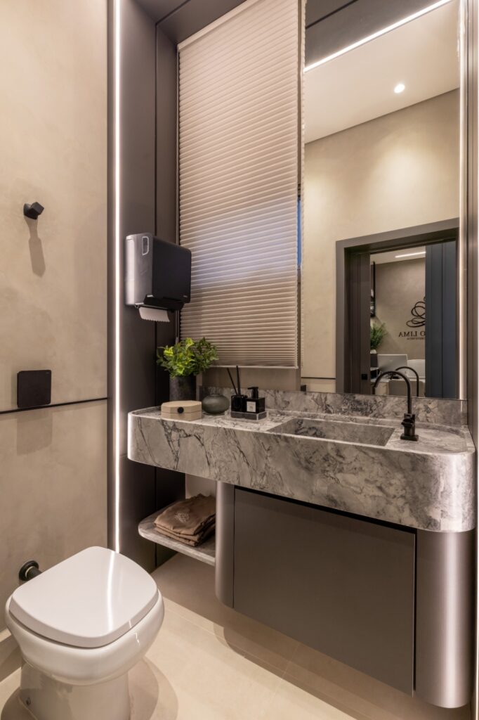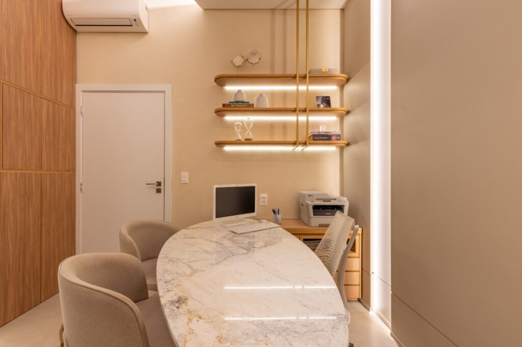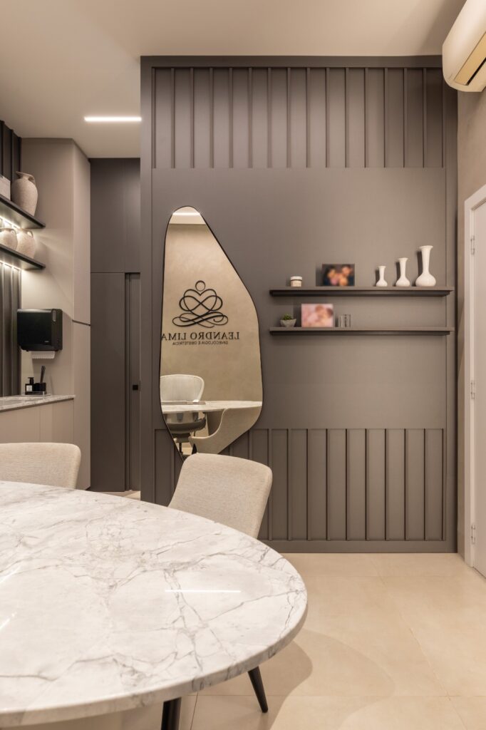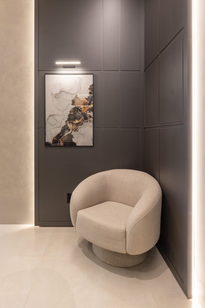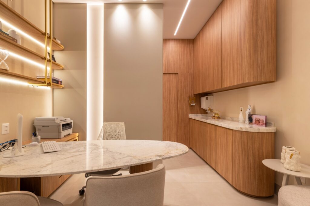 O design traduz leveza e serenidade. As linhas suaves do mobiliário e a iluminação delicada transmitem calma, enquanto os materiais nobres e contemporâneos reforçam a seriedade e o compromisso com a excelência médica. O equilíbrio entre estética e funcionalidade garante que cada consulta seja realizada em um espaço que inspira confiança e tranquilidade.