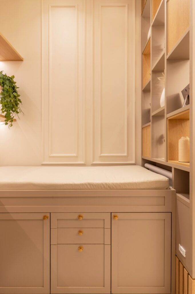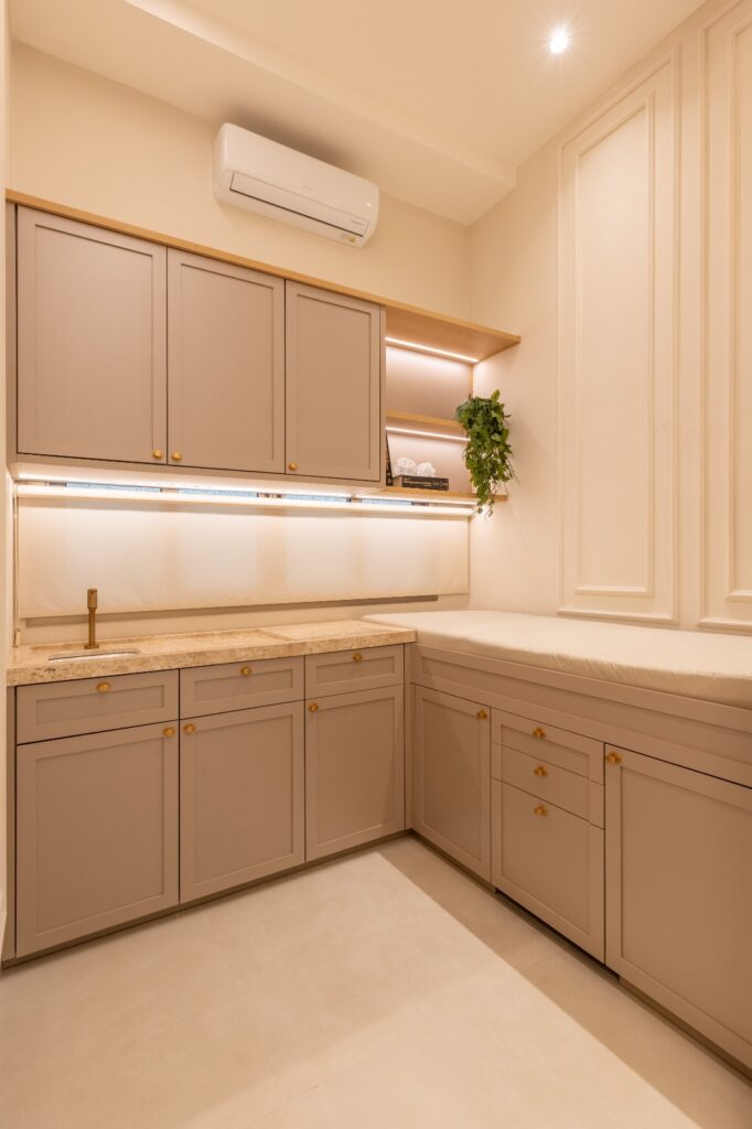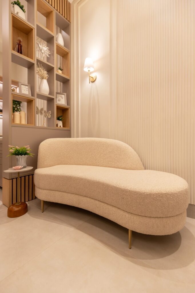 A sofisticação discreta do mobiliário, aliada a elementos dourados e texturas aconchegantes, cria um ambiente que acolhe sem perder a elegância. Cada detalhe, da marcenaria cuidadosamente planejada ao desenho da iluminação, foi pensado para que o espaço não seja apenas funcional, mas também um convite ao bem-estar.