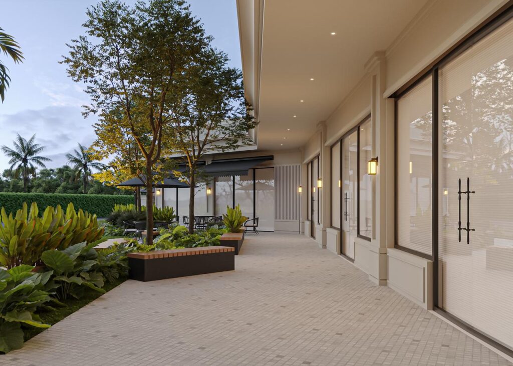 O paisagismo, cuidadosamente integrado à fachada, suaviza a imponência da estrutura, criando harmonia entre o ambiente urbano e a natureza. Grandes panos de vidro permitem a entrada abundante de luz natural, reforçando a transparência e a modernidade do projeto, ao mesmo tempo em que ampliam a sensação de conexão com o exterior.